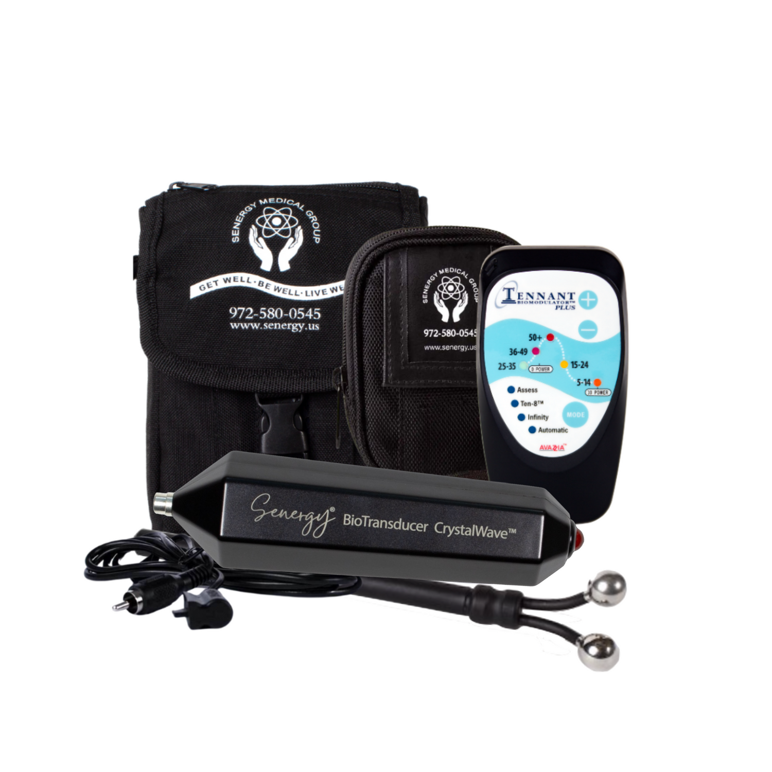 Tennant BioModulator Plus + Senergy's BioTransducer CrystalWave™ III, Y-Electrode attachment, carrying cases, and more! Everything you need to treat pain and inflammation and reset your body's polarities.