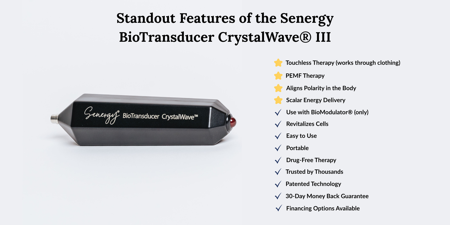 Check out our Senergy BioTransducer CrystalWave® Pro, a more powerful tool with red & blue light therapy & PEMF options.